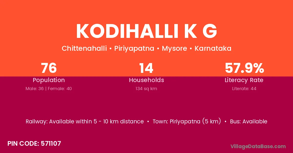 Piriyapatna (5 km) is the nearest town to Kodihalli K G village for major economic activities and is located approximately 5 km away.