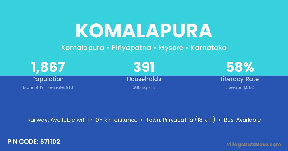 Piriyapatna (18 km) is the nearest town to Komalapura village for major economic activities and is located approximately 18 km away.