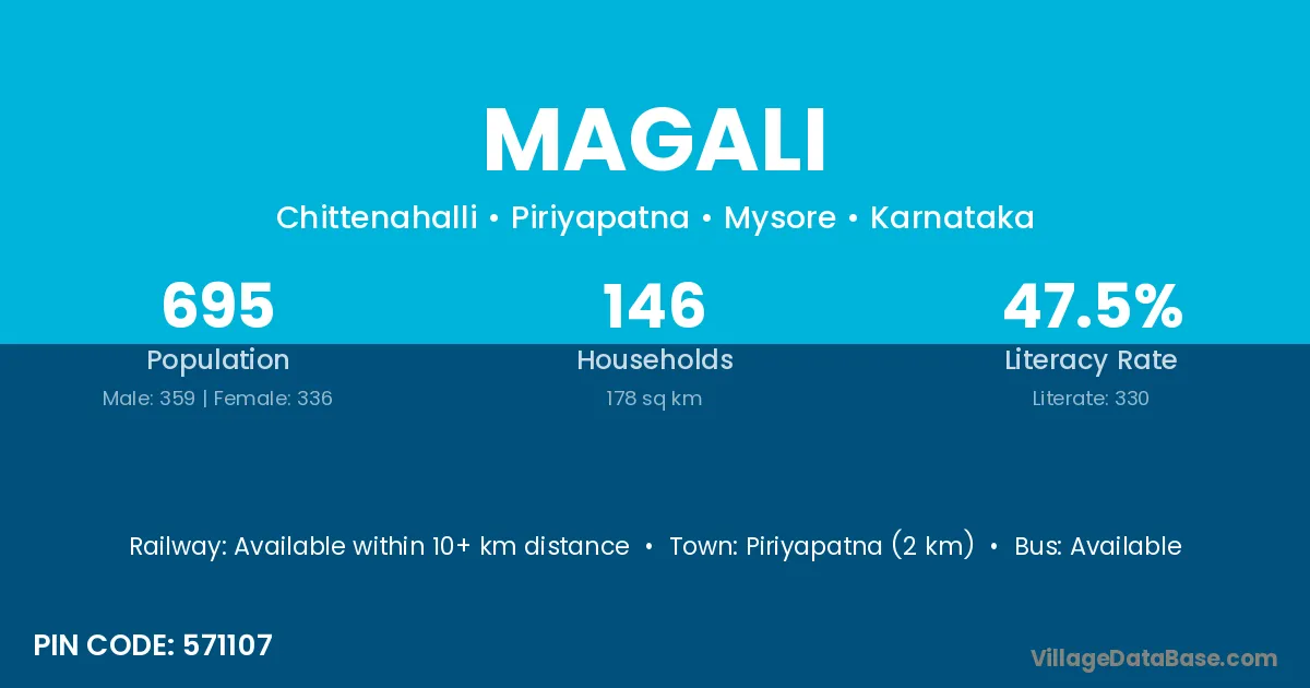 Piriyapatna (2 km) is the nearest town to Magali village for major economic activities and is located approximately 2 km away.