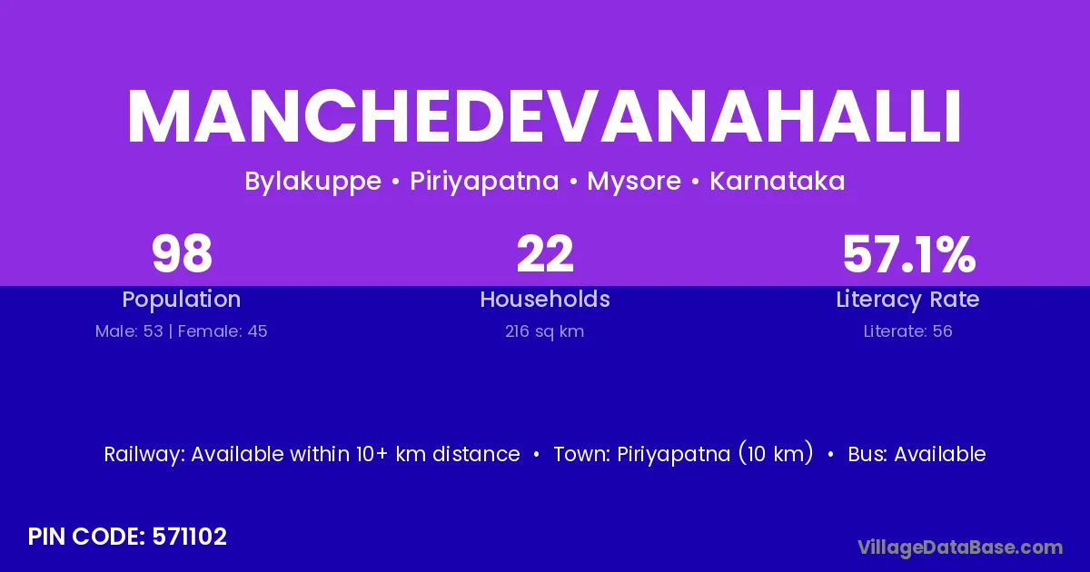 Manchedevanahalli village has a total population of 98 people, of which 53 are males and 45 are females.