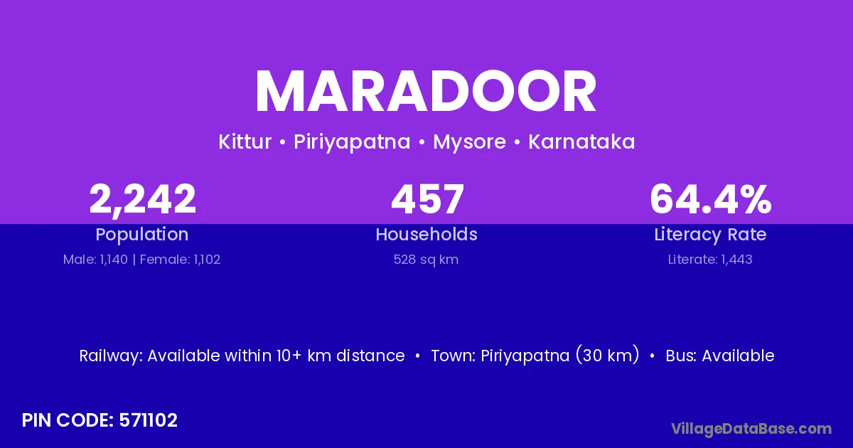 Piriyapatna (30 km) is the nearest town to Maradoor village for major economic activities and is located approximately 30 km away.
