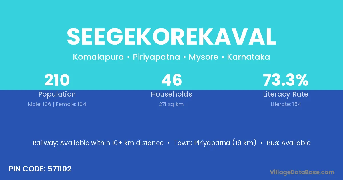 Piriyapatna (19 km) is the nearest town to Seegekorekaval village for major economic activities and is located approximately 19 km away.