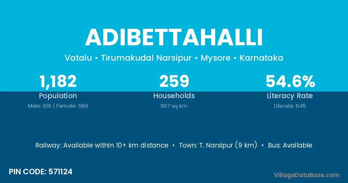 Adibettahalli village has a total population of 1,182 people, of which 616 are males and 566 are females.