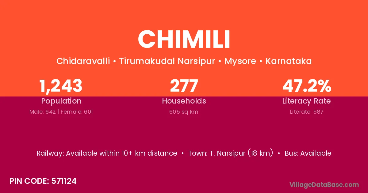 T. Narsipur (18 km) is the nearest town to Chimili village for major economic activities and is located approximately 18 km away.