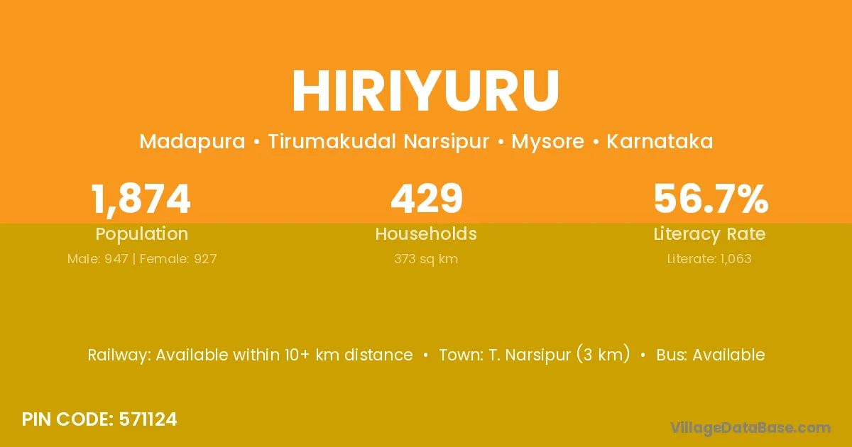 Hiriyuru village has a total population of 1,874 people, of which 947 are males and 927 are females.