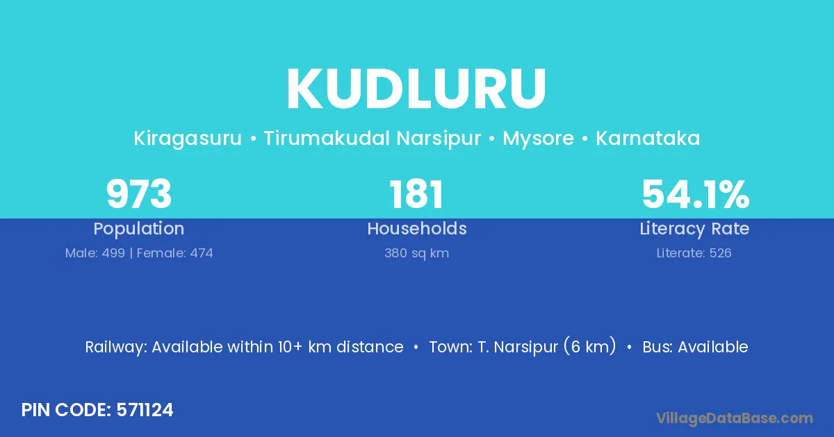 T. Narsipur (6 km) is the nearest town to Kudluru village for major economic activities and is located approximately 6 km away.