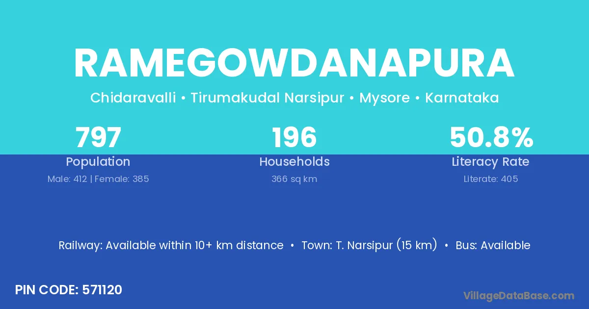 Ramegowdanapura village has a total population of 797 people, of which 412 are males and 385 are females.