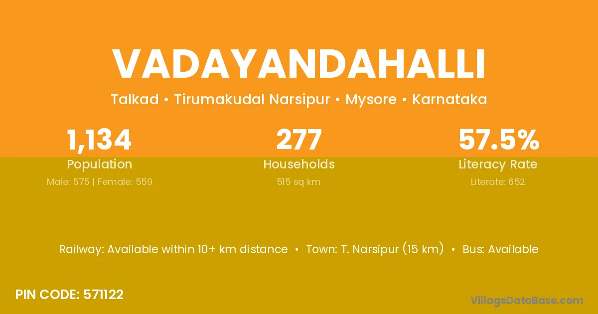 T. Narsipur (15 km) is the nearest town to Vadayandahalli village for major economic activities and is located approximately 15 km away.