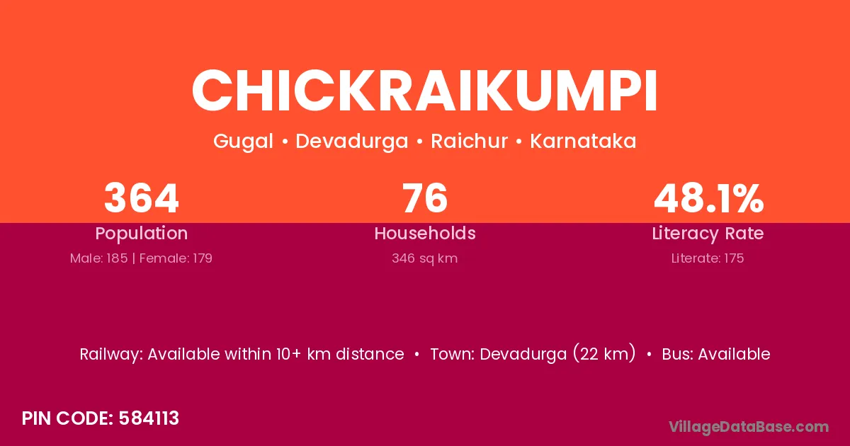 Devadurga (22 km) is the nearest town to Chickraikumpi village for major economic activities and is located approximately 22 km away.