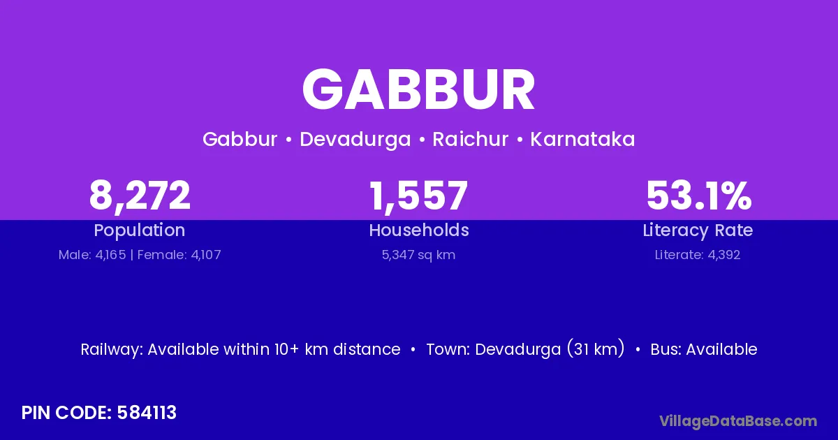Devadurga (31 km) is the nearest town to Gabbur village for major economic activities and is located approximately 31 km away.