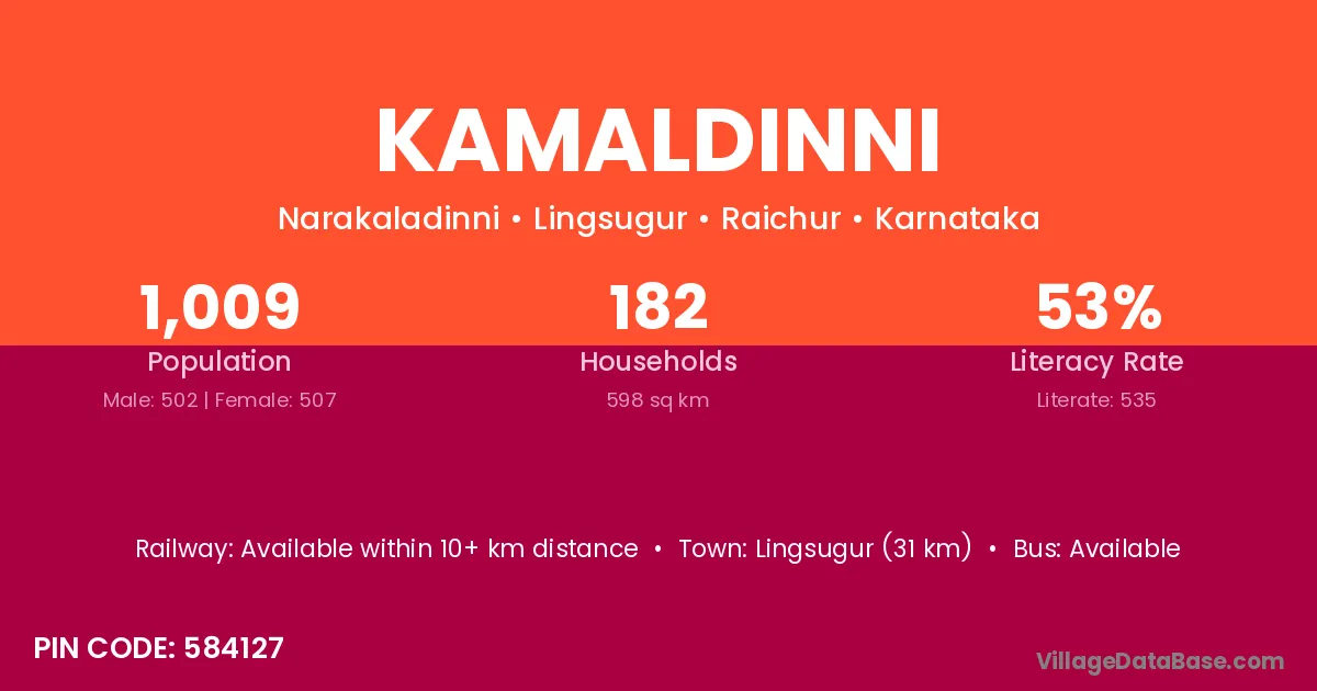 Devadurga (30 km) is the nearest town to Kamaldinni village for major economic activities and is located approximately 30 km away.