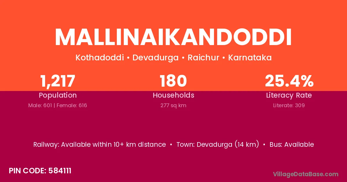 Devadurga (14 km) is the nearest town to Mallinaikandoddi village for major economic activities and is located approximately 14 km away.
