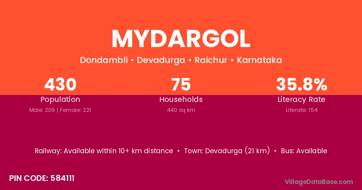 Devadurga (21 km) is the nearest town to Mydargol village for major economic activities and is located approximately 21 km away.