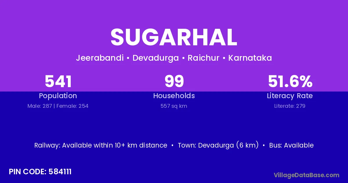 Devadurga (6 km) is the nearest town to Sugarhal village for major economic activities and is located approximately 6 km away.