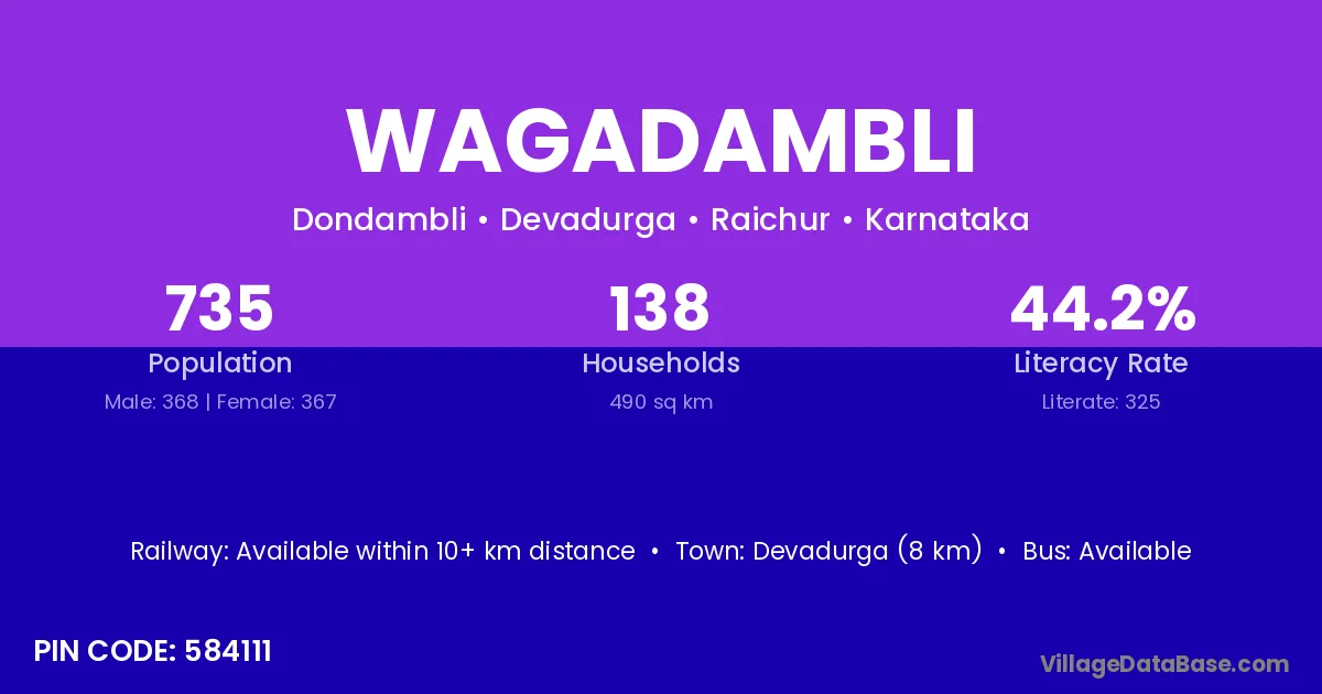Devadurga (8 km) is the nearest town to Wagadambli village for major economic activities and is located approximately 8 km away.
