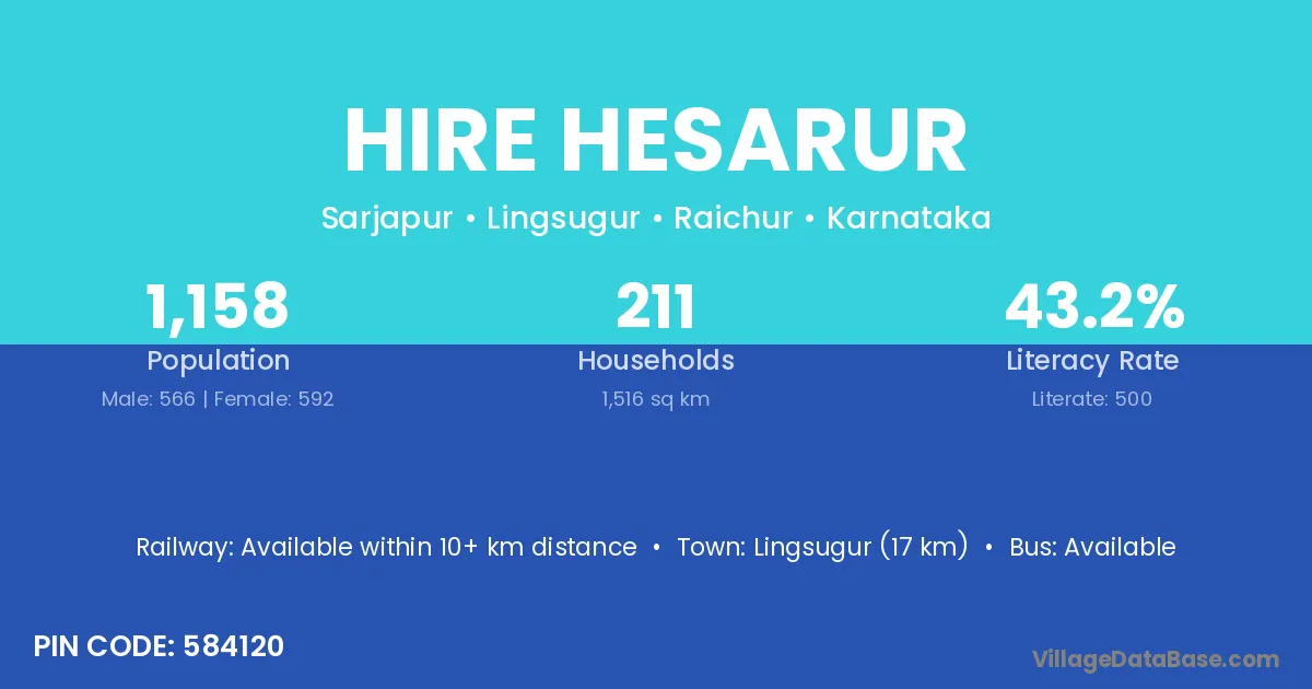 Lingsugur (17 km) is the nearest town to Hire Hesarur village for major economic activities and is located approximately 17 km away.