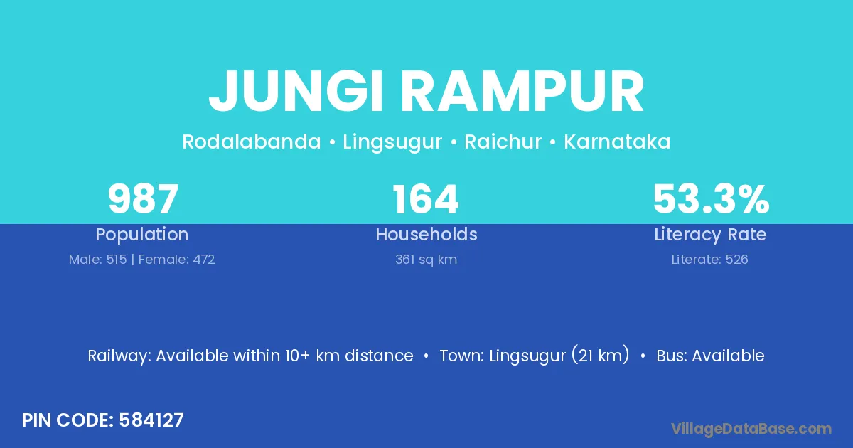 Lingsugur (21 km) is the nearest town to Jungi Rampur village for major economic activities and is located approximately 21 km away.