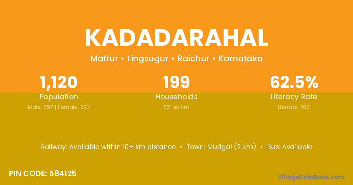 Mudgal (2 km) is the nearest town to Kadadarahal village for major economic activities and is located approximately 2 km away.
