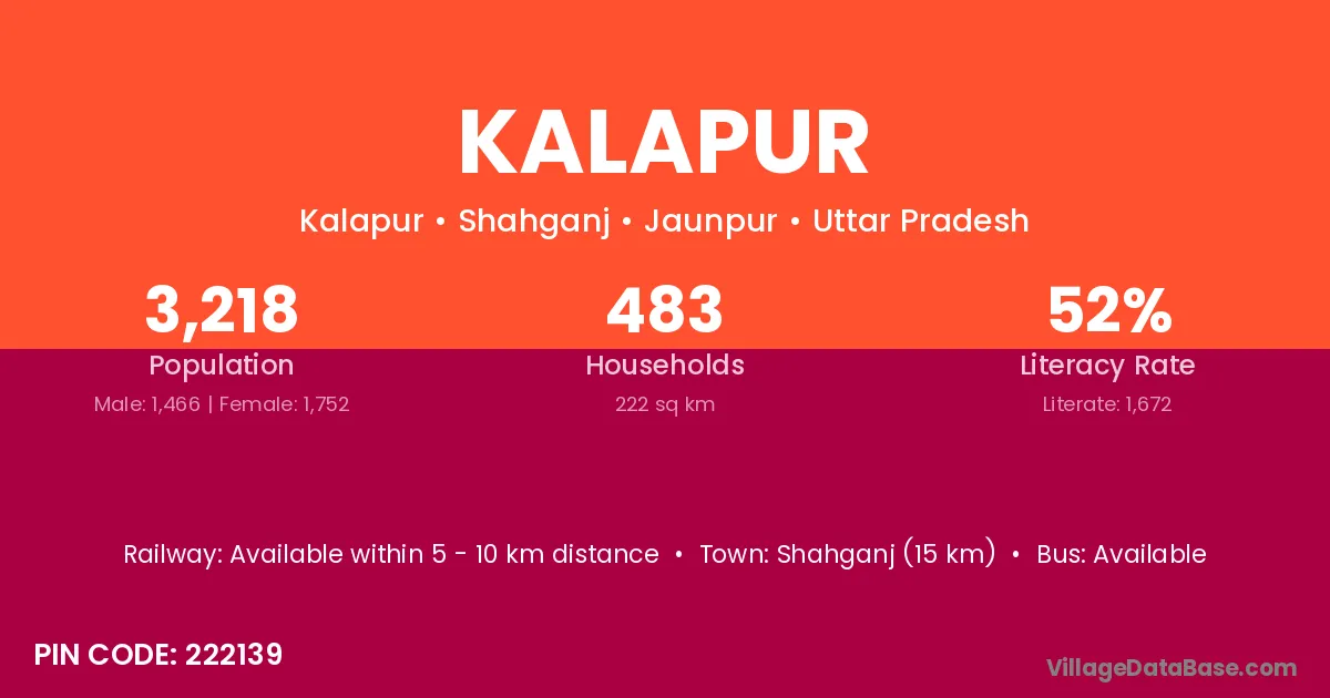 The literacy rate of Kalapur village is 46.09%. Male literacy stands at 54.81% and female literacy at 36.81%.