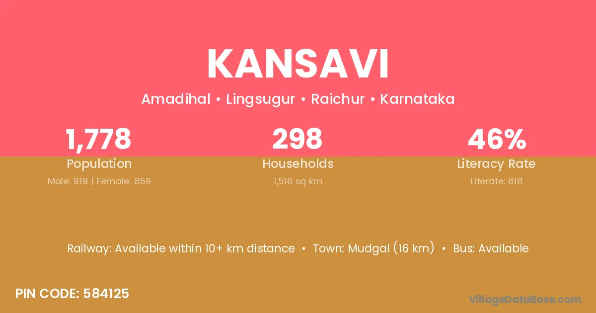 Mudgal (16 km) is the nearest town to Kansavi village for major economic activities and is located approximately 16 km away.