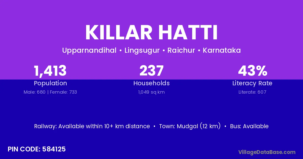 Mudgal (12 km) is the nearest town to Killar Hatti village for major economic activities and is located approximately 12 km away.