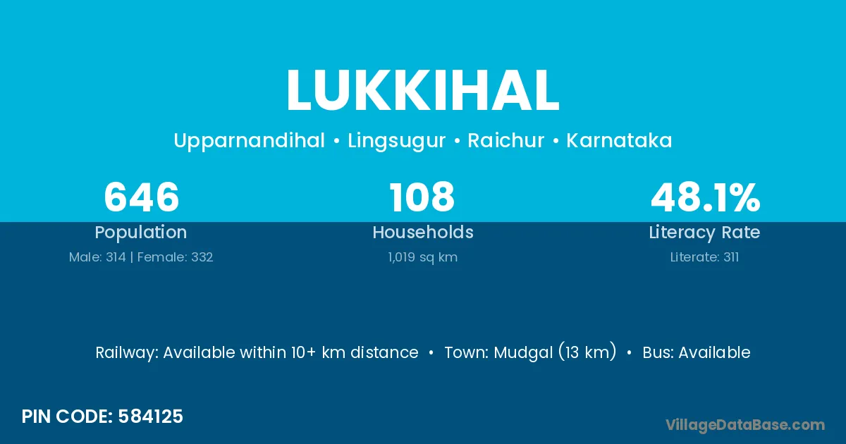 Mudgal (13 km) is the nearest town to Lukkihal village for major economic activities and is located approximately 13 km away.
