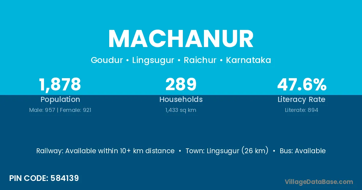 Lingsugur (26 km) is the nearest town to Machanur village for major economic activities and is located approximately 26 km away.