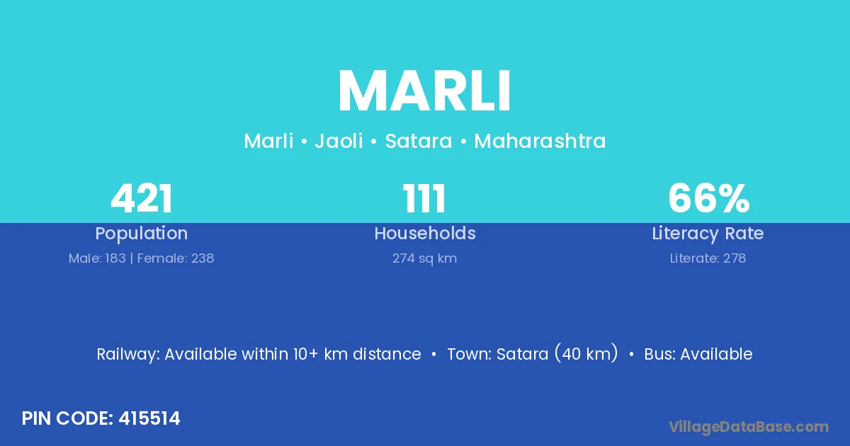 The literacy rate of Marli village is 44.54%. Male literacy stands at 52.82% and female literacy at 35.26%.