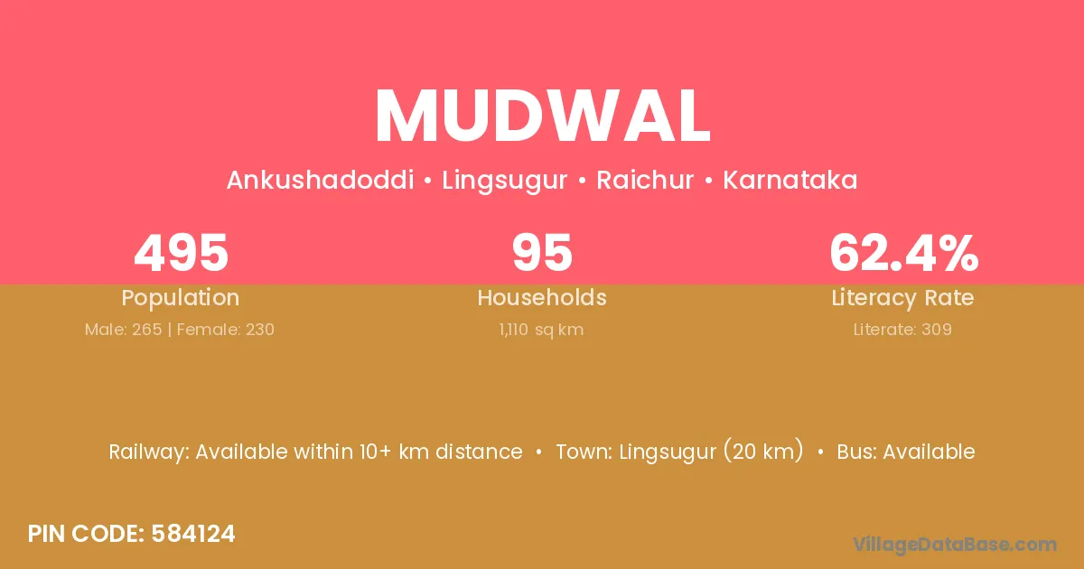 Lingsugur (20 km) is the nearest town to Mudwal village for major economic activities and is located approximately 20 km away.