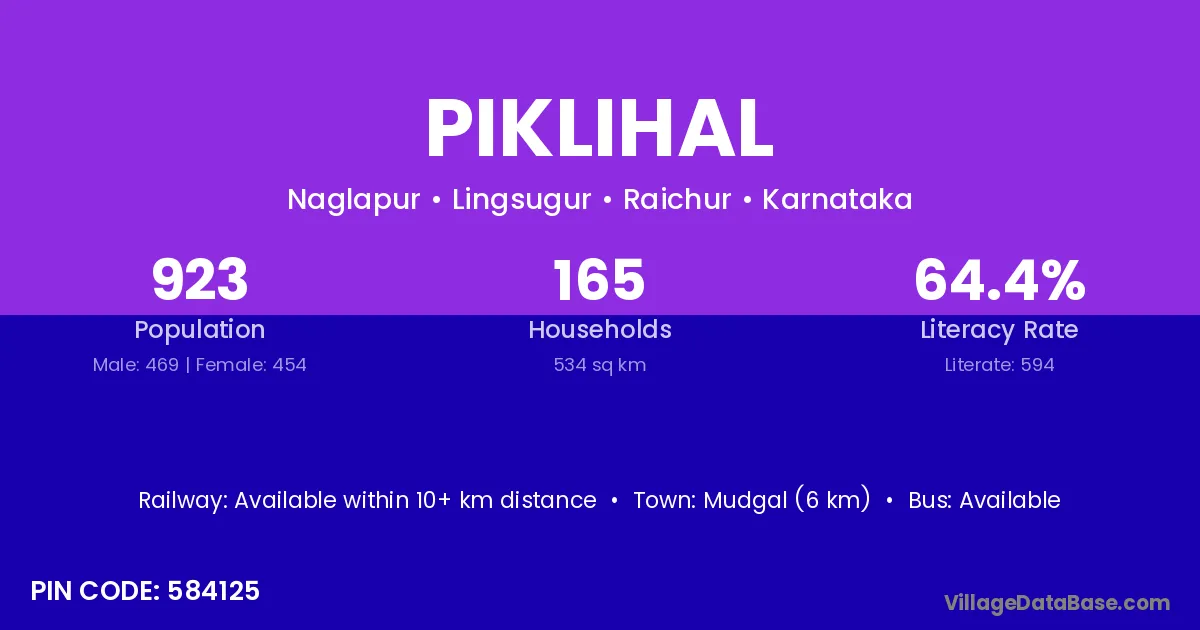 Mudgal (6 km) is the nearest town to Piklihal village for major economic activities and is located approximately 6 km away.