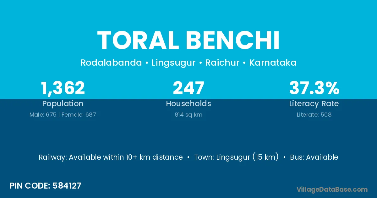 Lingsugur (15 km) is the nearest town to Toral Benchi village for major economic activities and is located approximately 15 km away.