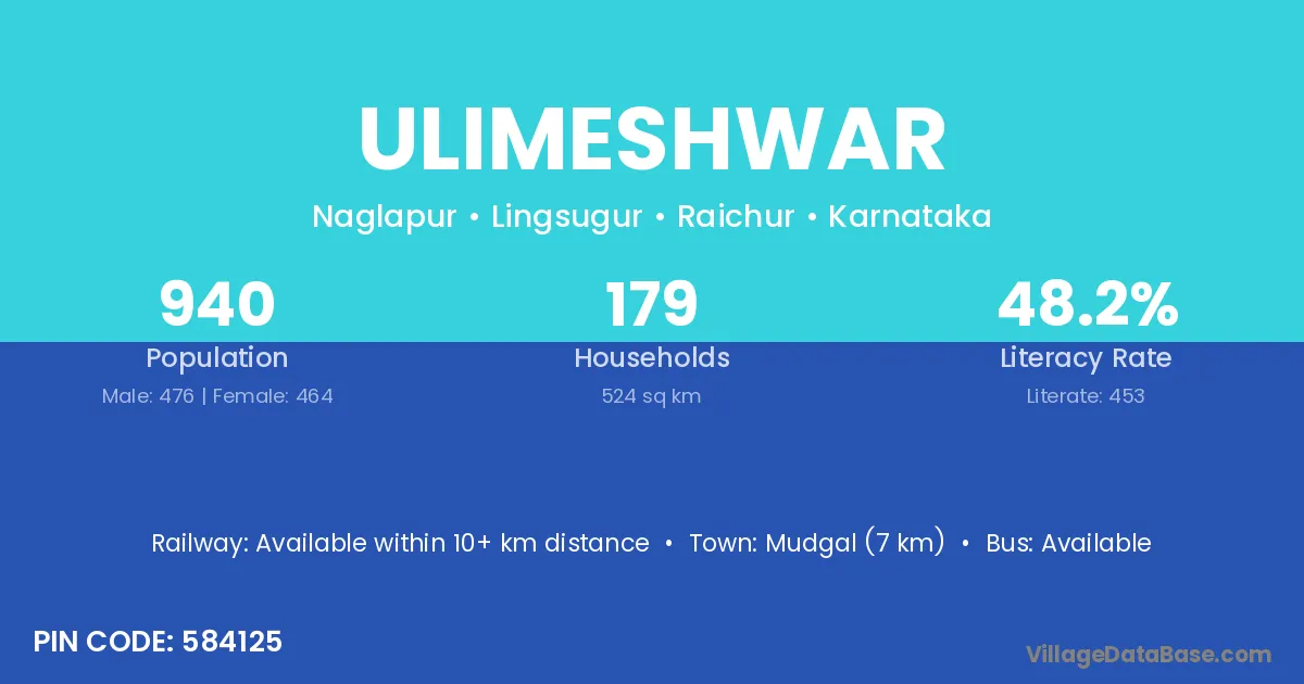 Mudgal (7 km) is the nearest town to Ulimeshwar village for major economic activities and is located approximately 7 km away.