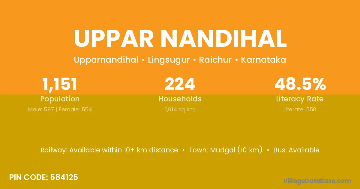 Mudgal (10 km) is the nearest town to Uppar Nandihal village for major economic activities and is located approximately 10 km away.