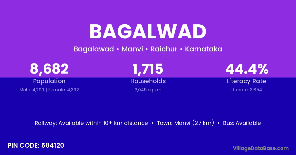 Manvi (27 km) is the nearest town to Bagalwad village for major economic activities and is located approximately 27 km away.
