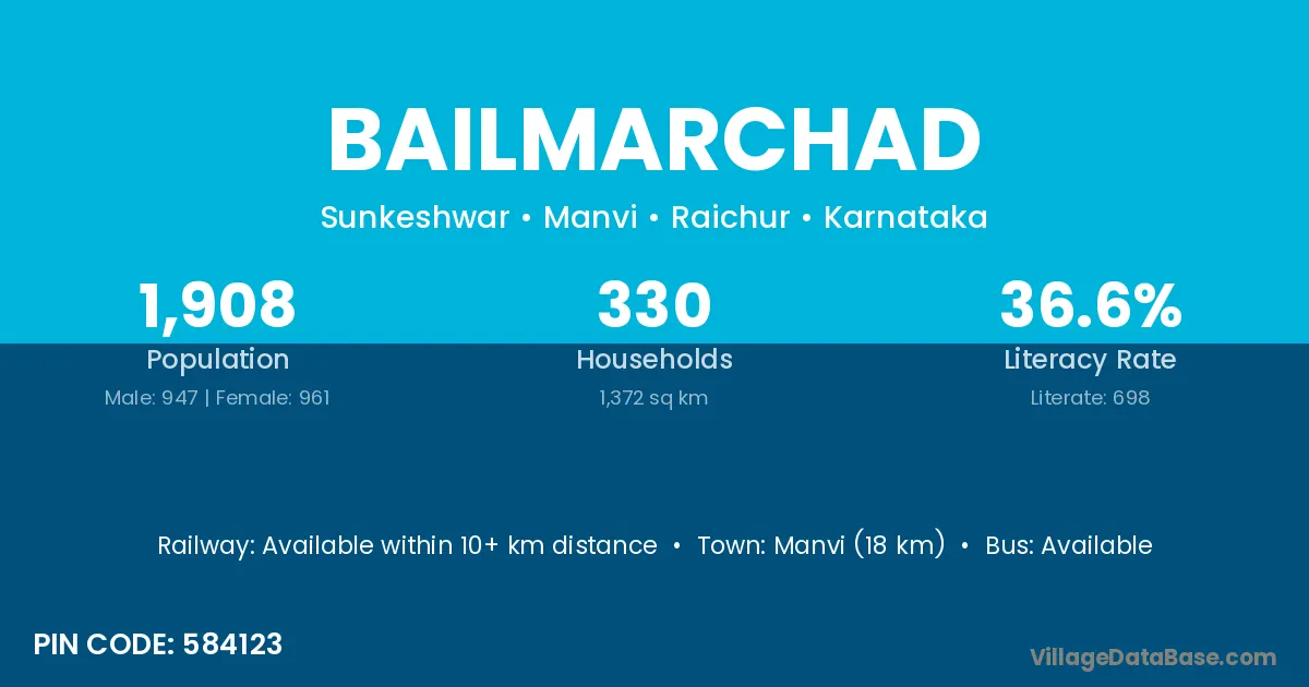 Manvi (18 km) is the nearest town to Bailmarchad village for major economic activities and is located approximately 18 km away.
