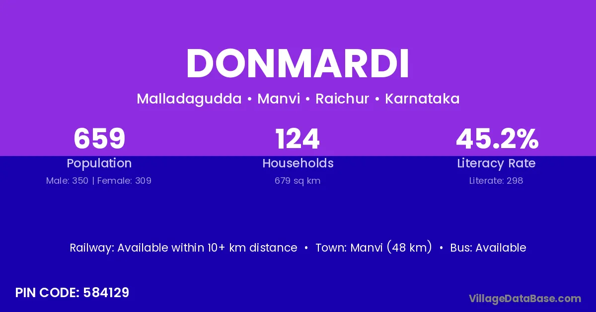 Manvi (48 km) is the nearest town to Donmardi village for major economic activities and is located approximately 48 km away.