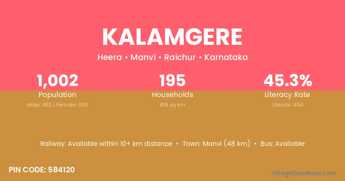 Manvi (48 km) is the nearest town to Kalamgere village for major economic activities and is located approximately 48 km away.
