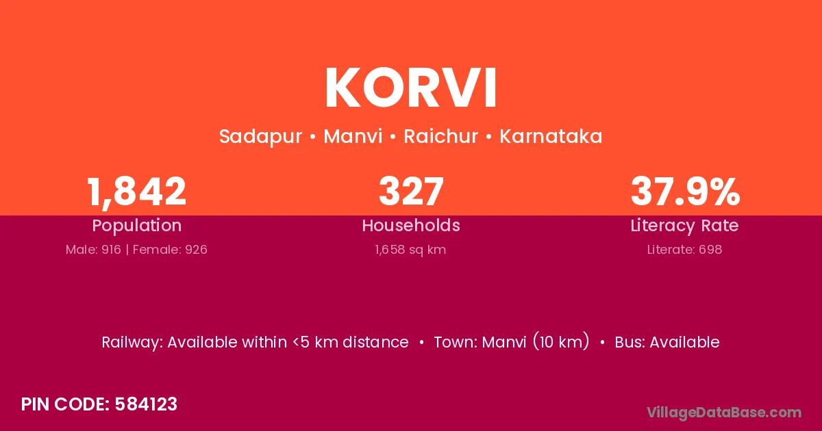 Manvi (10 km) is the nearest town to Korvi village for major economic activities and is located approximately 10 km away.