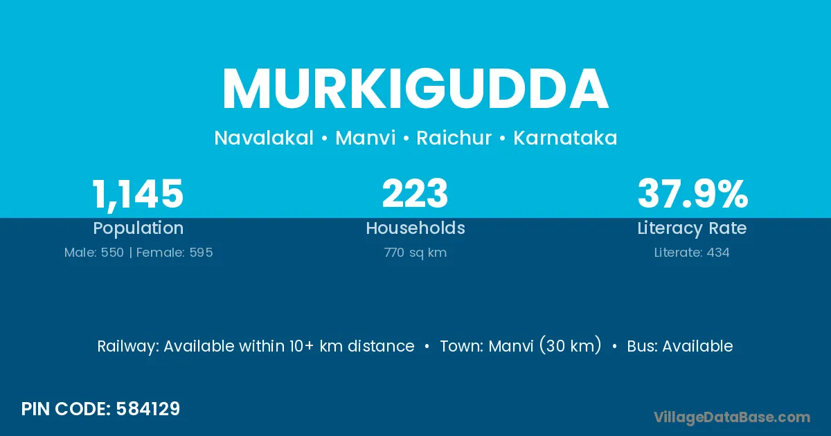 Murkigudda village has a total population of 1,145 people, of which 550 are males and 595 are females.