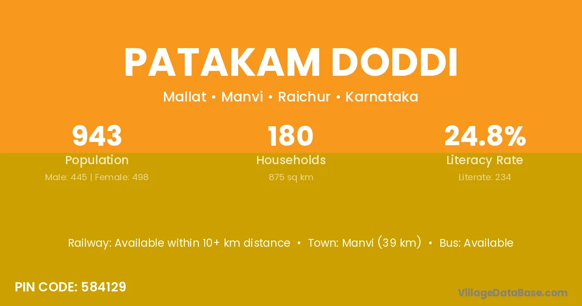 Patakam Doddi village has a total population of 943 people, of which 445 are males and 498 are females.