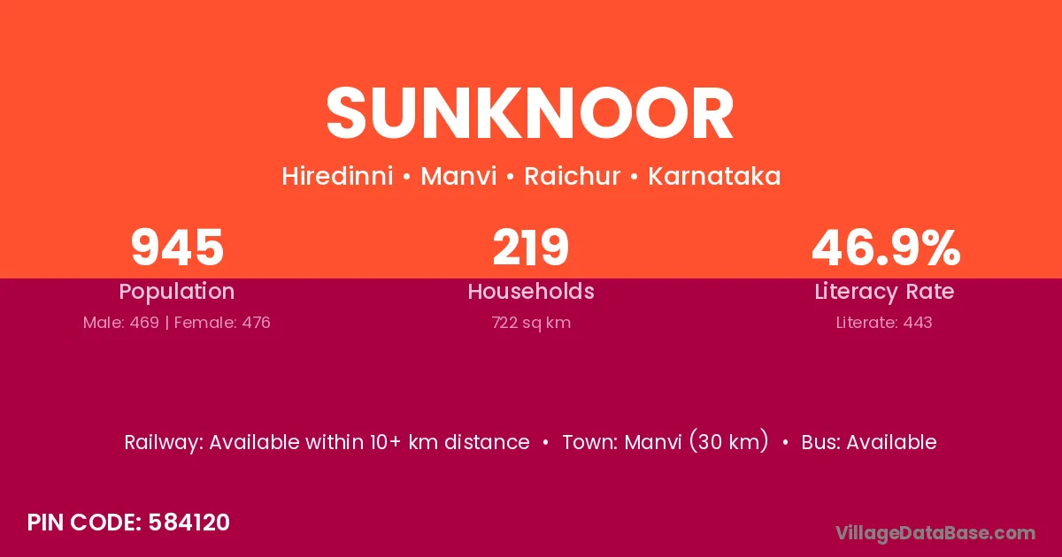Sunknoor village has a total population of 945 people, of which 469 are males and 476 are females.