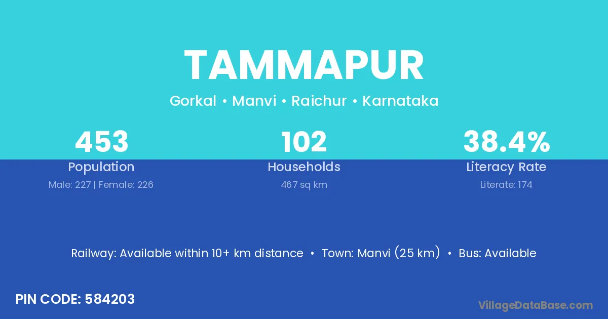 Tammapur village has a total population of 453 people, of which 227 are males and 226 are females.