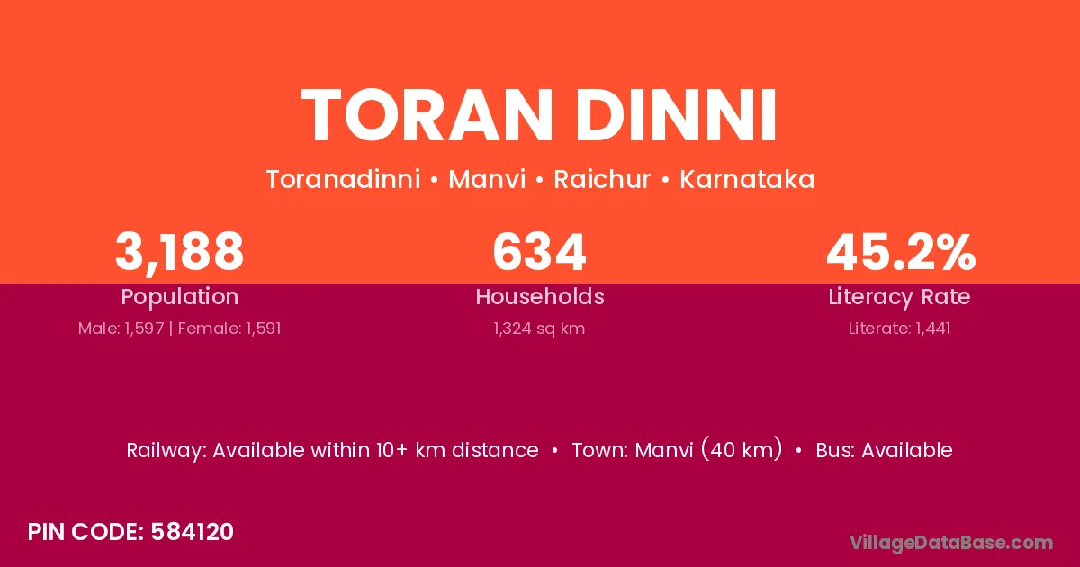 Manvi (40 km) is the nearest town to Toran Dinni village for major economic activities and is located approximately 40 km away.