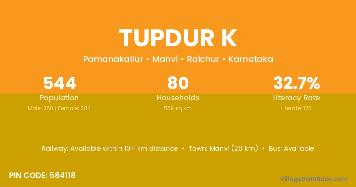 Manvi (20 km) is the nearest town to Tupdur K village for major economic activities and is located approximately 20 km away.