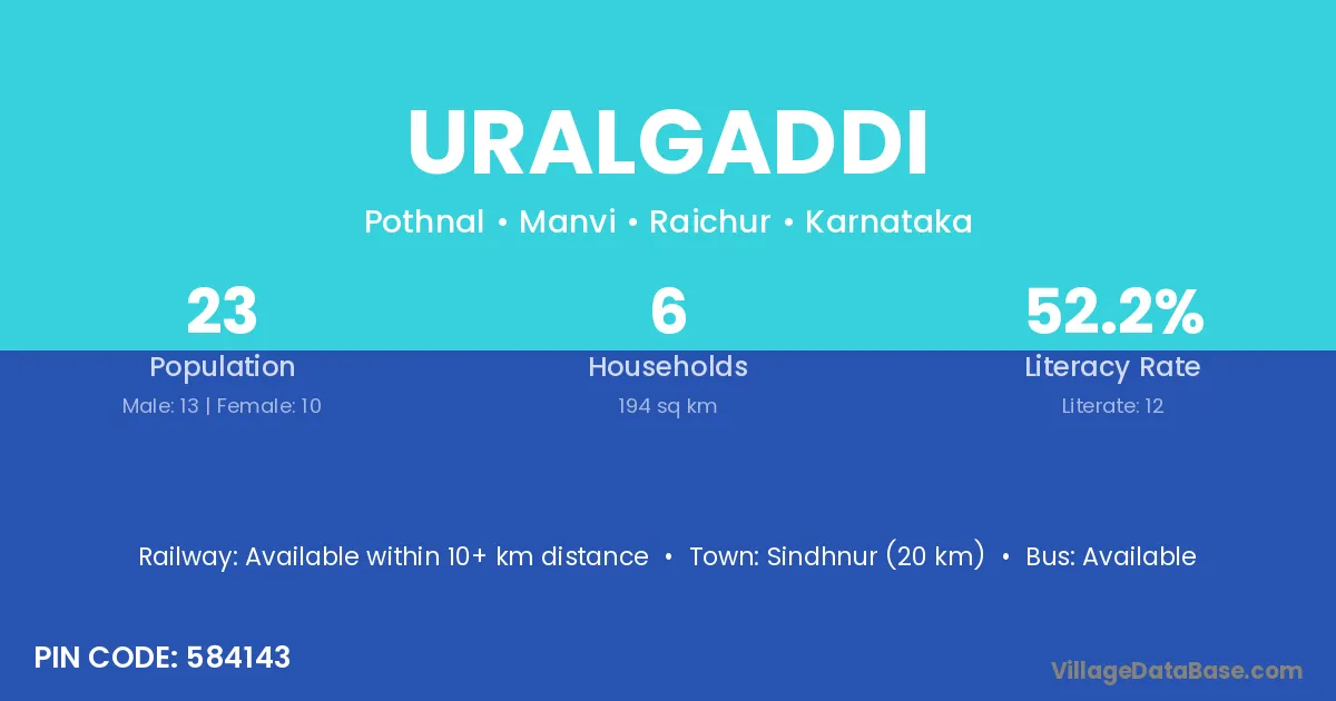 Sindhnur (20 km) is the nearest town to Uralgaddi village for major economic activities and is located approximately 20 km away.
