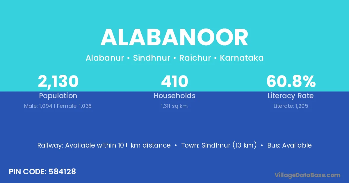 Sindhnur (13 km) is the nearest town to Alabanoor village for major economic activities and is located approximately 13 km away.