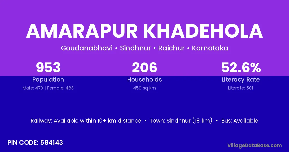 Sindhnur (18 km) is the nearest town to Amarapur Khadehola village for major economic activities and is located approximately 18 km away.
