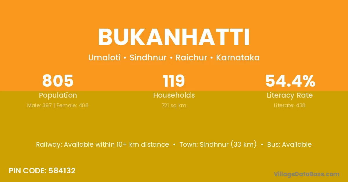 Sindhnur (33 km) is the nearest town to Bukanhatti village for major economic activities and is located approximately 33 km away.