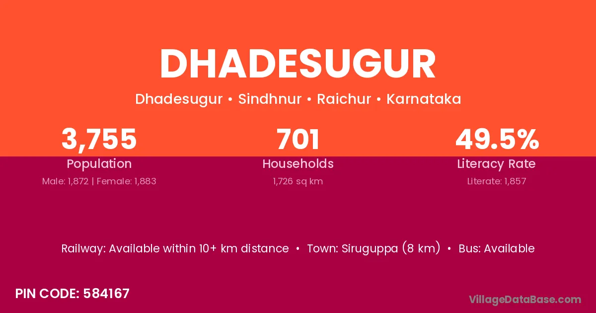 Dhadesugur village has a total population of 3,755 people, of which 1,872 are males and 1,883 are females.