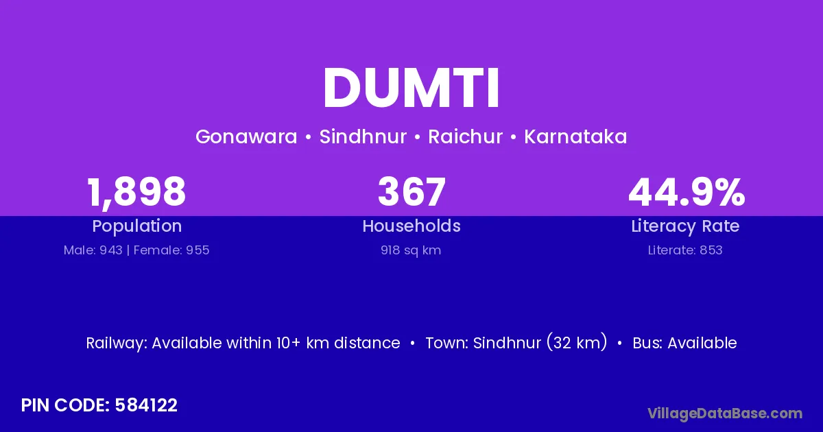 Sindhnur (32 km) is the nearest town to Dumti village for major economic activities and is located approximately 32 km away.